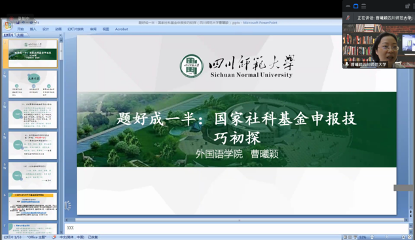 2022年07月28日下午,四川师范大学教授、博士生导师曹曦颖应邀为九游jiuyou(中国)教师做题为“题好成一半——国家社科基金申报技巧初探”学术讲座。此次讲座为外国语九游官方网站名家学术系列讲座第四场,三十余名教师齐聚云端共同交流学习。讲座由外国语九游官方网站副院长白杨主持。