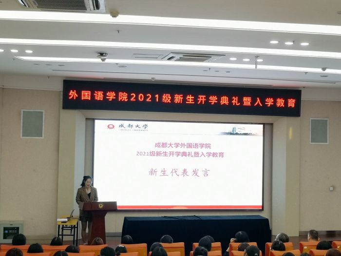 随后由新生代表发言,来自2021级英语4班巫建楠同学首先向给予关心与支持的师长和亲友表示感谢,为自己能够来到成大感到高兴。“来到成大便意味着新的开始,在更广阔的天地间,我们将看见更浩瀚的风景,也可能要面对更汹涌的风浪。我们深知,前方可能会有无数的挑战。困难面前,或许有人会望而却步,但我们迈入成大、成为成大人的那一刻起,就要展现出该有的精气神。”巫建楠同学表示应该珍惜青春,迸展现自己的活力,在成都大学这一片热土上为中国梦增添自己的一份力量!