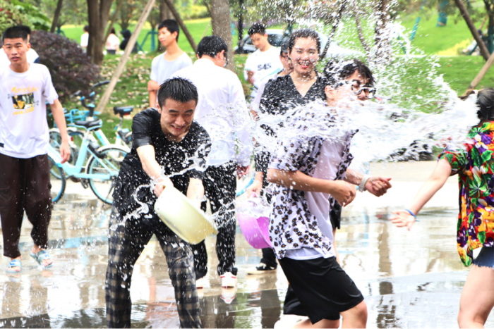 在舞蹈、歌唱和选美大赛之后,同学们盼望已久的泼水狂欢开始了。在泰国文化里,泼水代表着洗去过去一年的不顺,新的一年重新出发。同学们在演播厅里卖力演出的汗水融在冰凉的水里,有的积极参加小游戏,有的用水管向四周喷洒,有的用盆互相泼水祝福,现场水花四溅,气氛十分活跃。
