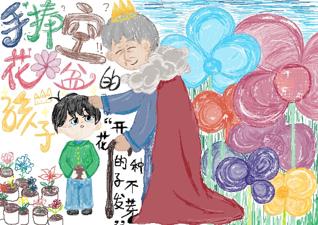 诚信主题宣传画作品《手捧空花盆的孩子》 作者:2021级泰语1班 黄静宇