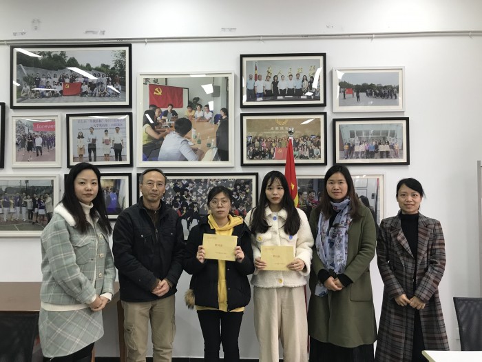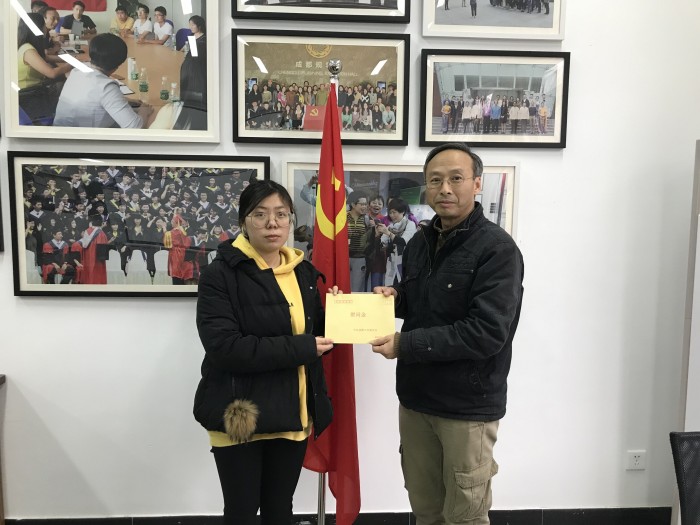 为贯彻落实《中共成都市委组织部办公室关于在元旦春节期间开展走访慰问生活困难党员、老党员、老干部活动的通知》, 切实做好元旦春节期间走访慰问生活困难党员工作,加强党内激励关爱帮扶,让党员切身感受到以习近平同志为核心的党中央关怀和温暖,感受到学校和九游官方网站党委的关心,2020年1月8日下午16:30外国语九游官方网站党委书记席原、党委副书记刘莉、学生党支部书记龙波宇、班主任程敏对韩珊珊、朱宣颖两名困难学生党员进行慰问。