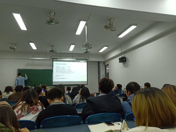 在课堂的最后,樊皇老师播放了一段美国电影The Interpreter的短片,让同学们通过视频图像更直观地了解到口译译员这份职业所承载的责任感与使命感,并不只是一份语言翻译的职业。同时,他也借此引出自己最后的话题,一名好的口译译员所需要具备的素质,即扎实的双语知识、广博的非语言知识、娴熟的口译技能、过硬的心理素质、良好的职业道德和最基本的爱国主义和家国情怀。接着,他向同学们介绍了几本与口译相关的书籍和提高听力水平的网站,让同学们更清楚地知道了自己未来所努力的方向。