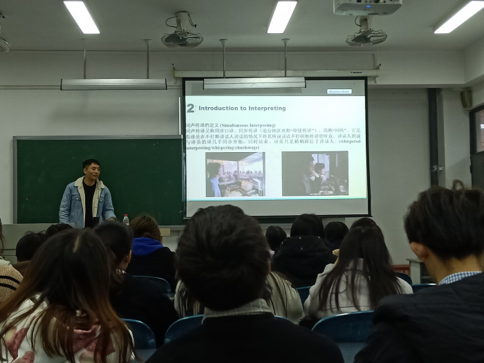 在课堂的开始,它先抛出了几个问题让同学们思考对于口译的理解以及成为一名好的口译需要具备哪些条件。通过这样一问一答的互动,较好地调动了同学们课堂上的积极性,也使得课堂更具有趣味性。接着,樊皇老师介绍了交替传译和同声传译地不同及发展,让同学们对口译这个职业有了更清楚更深刻的认识。在介绍同声传译时,樊皇老师还分享了他参加过的几场大型会议,如亚洲教育论坛、中国(四川)南亚圆桌会议、西博会等的同传经验和趣闻,使得原以为会枯燥乏味的同传介绍在具有专业性的同时更不乏趣味性,在课上同学们也常以笑声来回应樊皇老师的讲解。