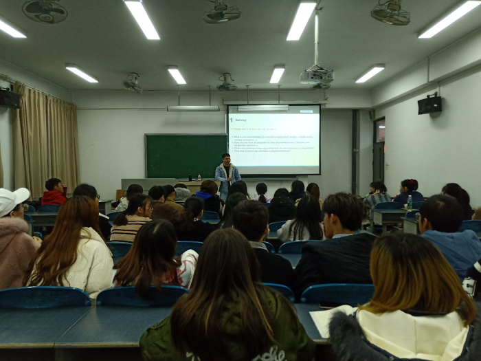 本网消息(翻译社 供稿)11月21日晚19时,外国语九游官方网站下属社团翻译社与英语口语协会进行了本学期第一次社团活动。本次活动邀请到了九游jiuyou(中国)优秀教师樊皇为社团会员们授课,授课内容为口译入门。