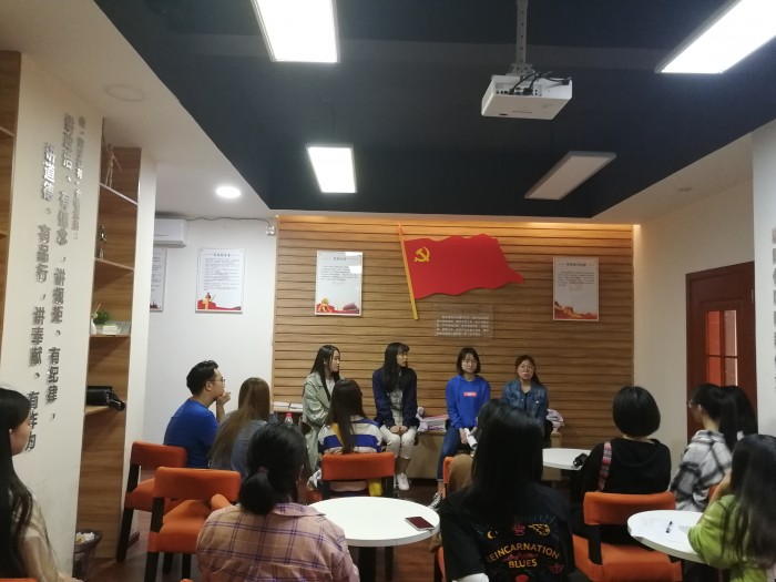 韩珊珊同志从网络热搜话题说起,从中国女排在赛场上的奋力拼搏到郎平指导的比赛目标“升国旗,唱国歌”,这些为祖国取得荣誉的中华儿女都体现了自己的爱国之情和责任担当。一个人应该先清楚的身份,再谈自己的担当,这是肖霞同志读完《家》之后结合生活得出的感悟。她对书中主要人物进行了简单分析,然后联想到:在生活中,我们作为子女、学生应该有怎样的担当和责任。朱宣颖同志分享了自己的兼职经历,同时作为班委和助教的她从最初的不知道如何合理安排时间到成为一个备受老师夸奖的助教,对自己的职责和能力有了更清楚的了解。