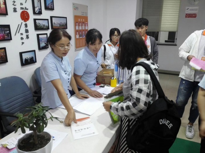 早上8点志愿者们早早地来到了各自负责的楼栋等待新生的到来,每个人都穿着整齐的服装,拿出崭新的面貌,带着微笑伫立在自己的岗位。新生需要到宿舍楼前报到站通过刷条形码完成信息核对,领取钥匙后就可以拎包入住,志愿者们的工作还是和往年一样帮助宿管阿姨分配钥匙,引导新生进行费用的补交,以及帮忙提行李和引路。来来回回的接送工作也并没有使志愿者们懈怠于自己的工作,他们热心的欢迎每一位新生的到来,帮家长学生们搬运行李,让刚踏入大学校园的新生们更快的适应校园生活。