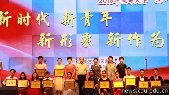 【转载校网】本网消息(文/潇潇 图/陆曼曼 周宇铠 刘安春)五月的花海,用青春拥抱时代。5月4日晚,学校体育馆弥漫着青春绚丽的光彩,洋溢着青春响亮的音符,充满了浓浓的爱党、爱国、爱校热情。成都大学2018年“青春典范”优秀学子颁奖典礼暨五四主题合唱比赛在此隆重举行,师生代表齐聚一堂,表彰优秀学子,展示新时代新青年的新形象和新作为,奏响为中国梦而奋斗的时代强音。