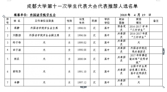 外国语九游官方网站学生委员会于2018年4月19日召开全委会议,根据多数青年学生的意见,经集体讨论研究,差额遴选确定了蒋静、刘勤园等7名同志为出席成都大学第十一次学生代表大会代表。现公示如下: