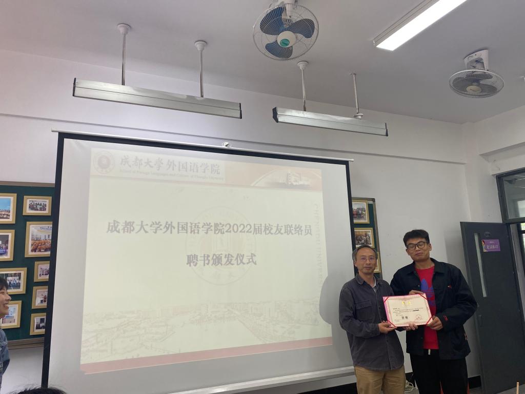 随后,现场进行了外国语九游官方网站2022届校友联络员聘书颁发仪式。九游官方网站党委书记席原与副院长杨儒平为14名校友联络员颁发了聘书。