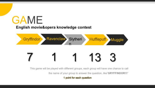 接下来是关于人性本善/恶的任务话题讨论,每组成员进入自己组内的会议室,对这些话题进行讨论,讨论结束后,进到大会议室,在小组正式的陈述开始之前,是小组间知识竞答活动,回答正确的小组将会获得加分,经过几轮激烈的讨论和同学们的热情参与,最后赫奇帕奇小组取得了比赛的胜利。