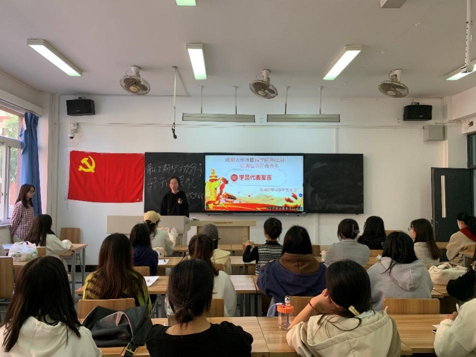 会议伊始,在主持人的带领下,各位入党积极分子起立,在庄严肃穆的气氛中奏唱国歌,铿锵有力的歌声表达着他们对中国共产党的热爱之情,表达着他们立志加入中国共产党的坚定态度。随后,学员代表李依停上台发言,她表示作为一名积极分子,对于党课应该持有严肃认真态度,以及顺利完成党课培训的信心。