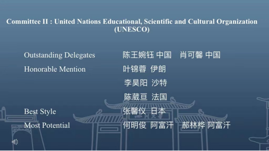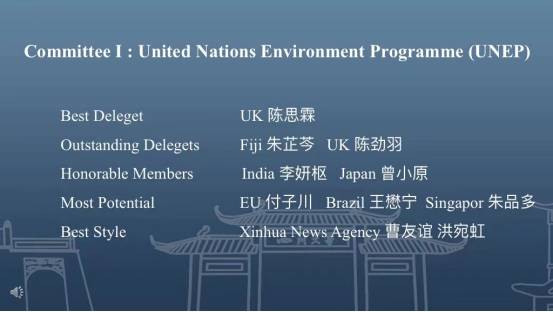 United Nations Environment Programme (UNEP)、United Nations Educational, Scientific and Cultural Organization (UNESCO)和欧盟委员会主席代表上台发言,对各委员会做了复盘和总结,并宣布了获奖名单。