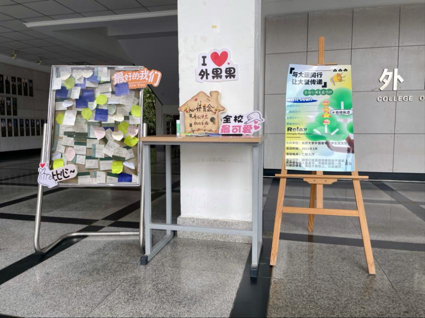 活动现场人流不断,气氛热烈。活动过程中,同学们在便签上写下对大运的祝福与愿景、自己的喜悦与烦恼,或直接贴于展板上,或将便签投入心情盲盒中,以此缓解心中的压力,甩掉烦恼的包袱,之后随机抽取一张便签,回复鼓励与安慰的话语,以此循环下去,消解烦恼、传递正能量。