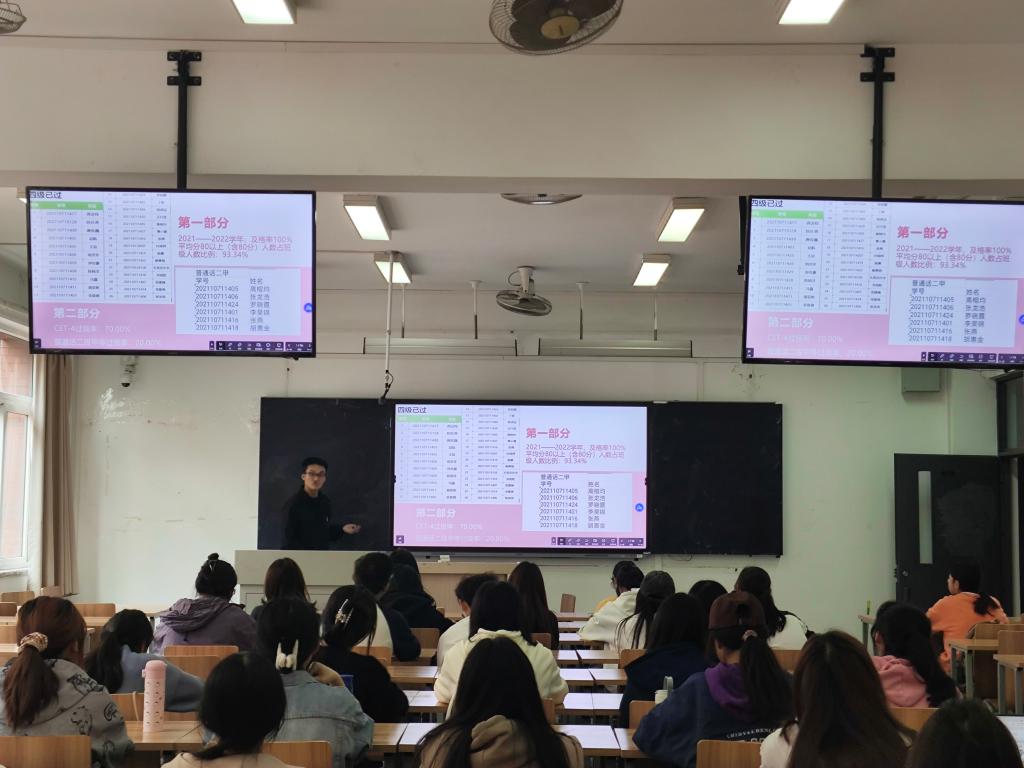 王增辉老师简单介绍了各先进班集体参选班级的情况,希望大家都以标兵为榜样,提升自己的综合能力。随后,各班级分别从理想信念、学习成绩、科研创新、学生工作和志愿服务等方面向大家汇报了取得的成绩,全场不时响起掌声和赞叹声。在先进班集体的学风建设经验中,共有来自外国语九游官方网站不同专业年级的7个先进班集体进行了分享,各先进班集体不仅都满足参评的学习成绩、课堂出勤和生活文明要求,且都各具风格,有的班级志愿服务理念蔚然成风,有的班级则在各项集体活动中都积极踊跃。