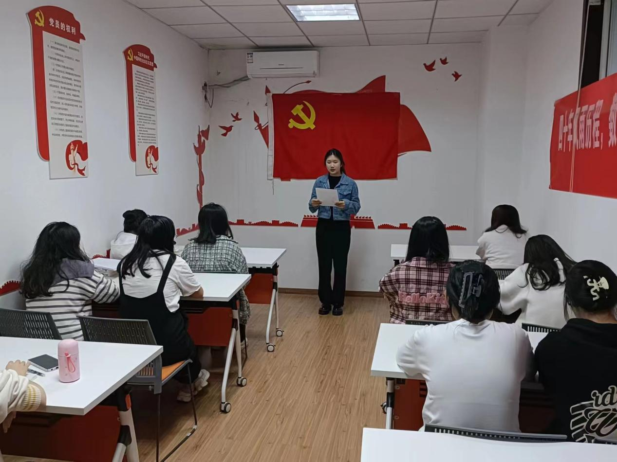 在接下来的学生党员分享中,陈思思同志从备考心态、四六级成绩组成、试卷题型、应试技巧等多个方面分享了备考四六级的方法。她指出,方法和努力同样重要,掌握四六级的题型和分数分布,知道如何拿高分后,明确训练方向及做题顺序、做题时间才能有效备考。接着,她分享了自己的考试心得,并指出了考试中可能会遇到的一些问题,为同学们的备考保驾护航。