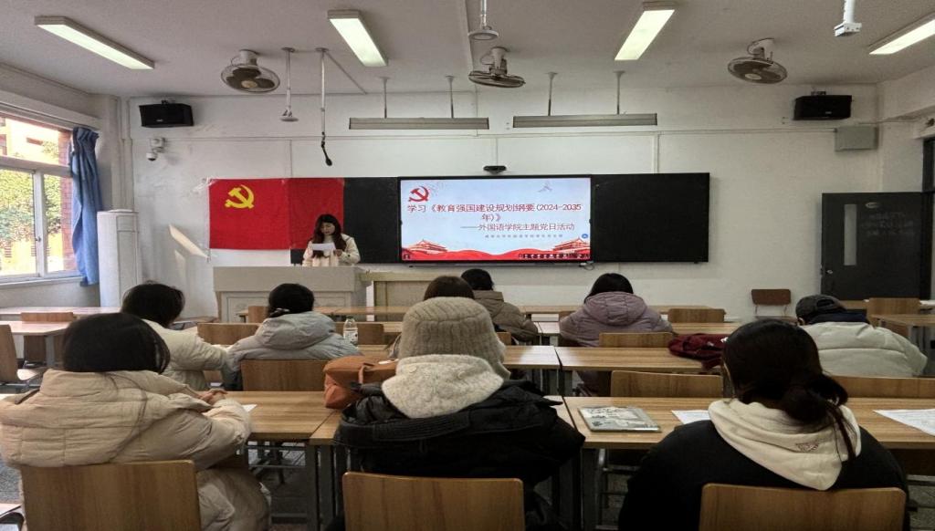 最后,主持人对本次党日活动进行简要总结。她表示,《教育强国建设规划纲要(2024 - 2035 年)》是引领我国教育事业未来发展的重要纲领。身处新时代,党员同志们要有高度的责任感和使命感,不仅要在知识学习上不断精进,更要发挥外语专业优势,促进多元文化交流,为培养具有国际视野的高素质人才贡献力量。最后,主持人号召各位党员同志积极带动身边同学,一同投身教育强国建设,为实现中华民族伟大复兴的中国梦而奋斗。