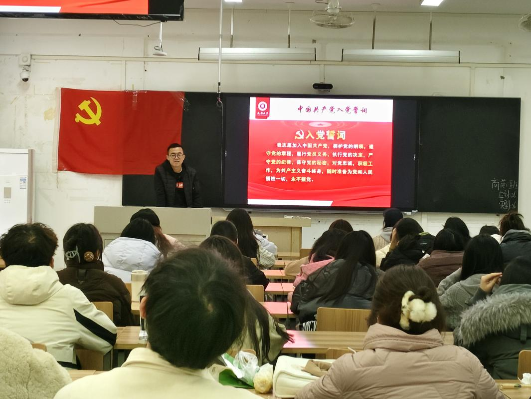 党课伊始,祝郁欣老师用入党誓词引入此次党课的主题—党的性质和纲领。祝老师强调,入党积极分子作为经各级组织推选的优秀青年,要深刻领会入党誓词的精神内涵,在日常学习与生活中以身作则,在党课学习中增进对党的理解,坚定不移地拥护党的领导,用实际行动向党组织靠拢。