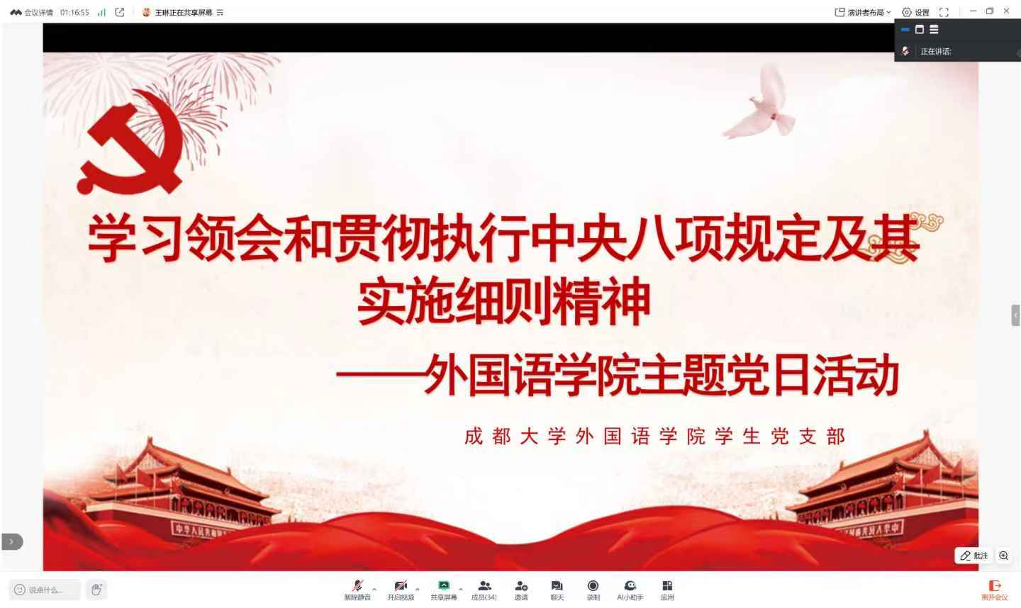活动最后,龙波宇老师强调,要把党史学习中的精神养分转化为践行中央八项规定及其实施细则的实际行动,将纪律要求内化为思想自觉和行为准则。鼓励全体党员在青春赛道上始终保持清醒头脑,用先锋行动彰显新时代学生党员的责任担当。