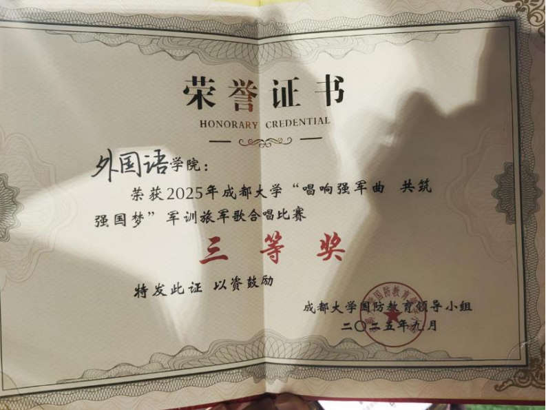最难忘的是军歌比赛,那是一场荣誉的“战歌”。各班的同学聚在一起,怀着共同的梦想,唱响青春,唱出欢乐。尽管排练之时曲调还差强人意,但,在军歌比赛的那个晚上,所有人团结一心,抱着必胜的决心,气势昂扬,一首串烧《我的祖国》+《强军战歌》点燃全场,掌声雷动,并荣获全校三等奖!所有外院学子的脸上无一不挂着笑容,那一刻,我读懂了“信念”的力量!
