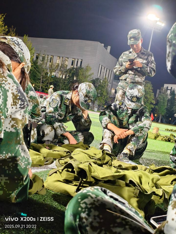 夜晚的操场褪去了白天的严苛。休息时我们坐在星空下。那些白天被晒化的思绪,在晚风中重新凝结。与陌生的新朋友坐在一起突破自己i人的舒适圈,分享日常生活,问起对方家乡,大家逐渐敞开心扉,聊着聊着,我们想起父母,想起舒适的家,想着军训后的日子。军训像一道清晰的分割线,隔开了被呵护的过去和需要独自奔跑的未来。它用最直接的方式告诉我:成长,从来不是匀速前进,而是在某些被压缩的时光里,完成剧烈的蜕变。