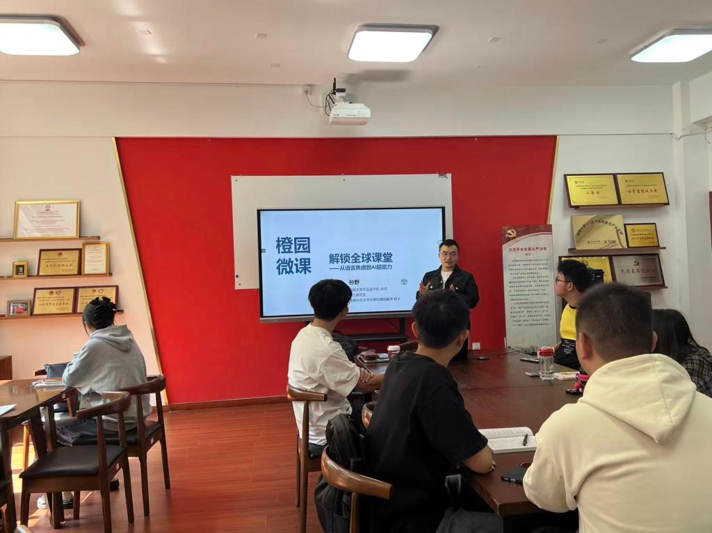 本网消息(文/图 龙波宇)智用新器强本领,凝心聚力开新局。2025年10月15日中午12:40,外国语九游官方网站学生党支部在2108组织开展了一场以“解锁全球课堂:从语言焦虑到AI‘超能力’”为主题的橙园微课,本次培训由孙野老师主讲。