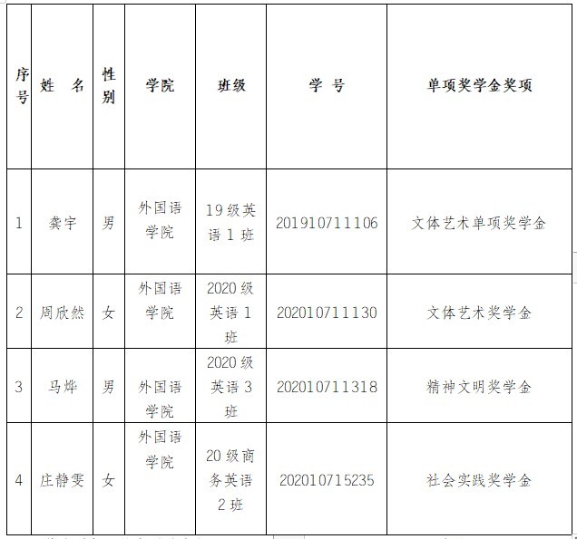 根据《成都大学单项奖学金评选办法》,本着“公平、公正、公开”的原则,推选出以下同学为单项奖学金获得者,现进行公示,公示期2021.11.12-2020.11.17,若有异议请于公示期内将情况反馈给2103办公室龙老师,电话:84616303.