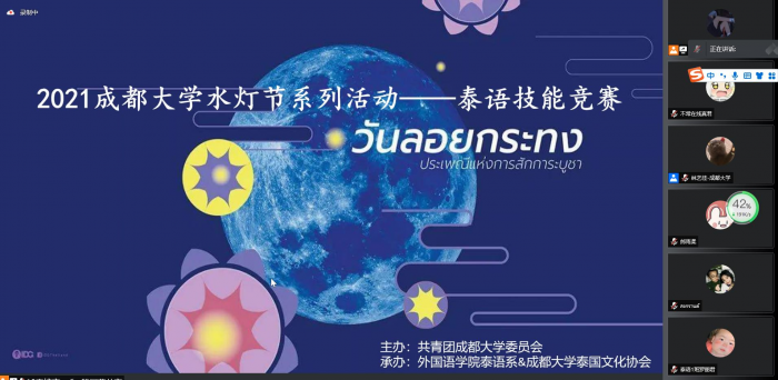 除了水灯制作外,水灯节系列活动——泰语技能竞赛在2021年11月23日下午以线上会议的形式举行。此次活动的邀请到泰语系荣誉教授关国兴教授、林艺佳老师、唐敏莉老师、泰教林青老师和李娜老师,以及2013级优秀毕业生黄胜伟、2016级赵靓。