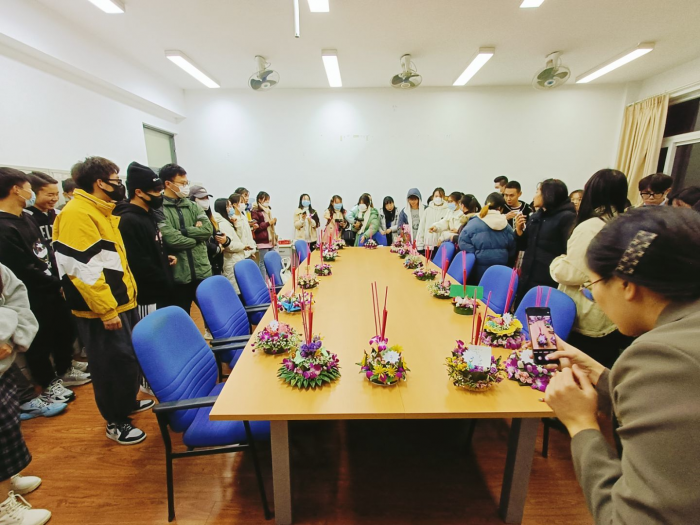 展示结束后,老师同学们移步室外的鹦鸣湖旁,在老师们的指导和严格按照疫情防控要求下,同学们佩戴口罩有序地走向湖边,将寄托在美好祝愿的水灯伴着泰国传统歌曲缓缓放入湖中。
