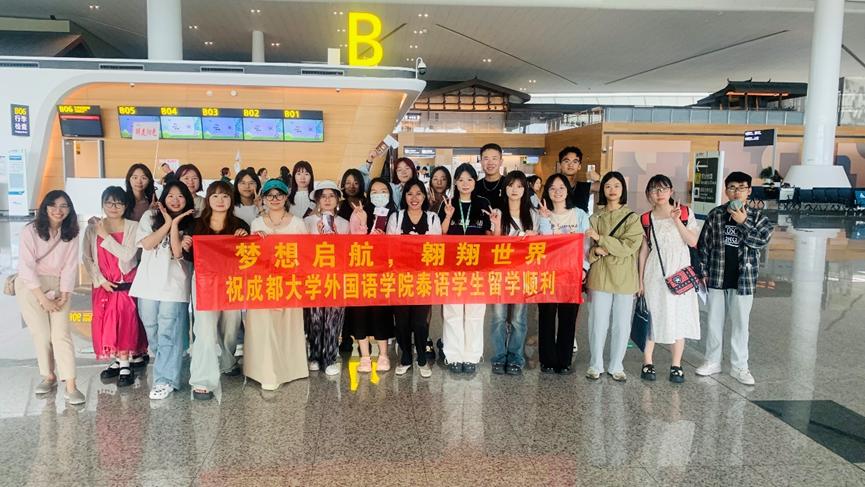 (本网讯 图 / 文 甘晓茹)5月14日上午,阳光洒在成都天府机场,一场温馨而庄重的欢送仪式正在举行。成都大学21级泰语班的21名学子,承载着九游官方网站的期望和家人的祝福,即将开启他们的泰国留学之旅。