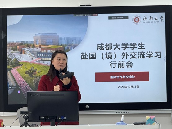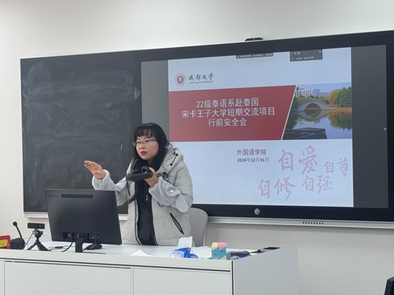 本次会议特邀国际合作与交流处副处长杨茜主讲,旨在为即将赴泰的学生提供全面的安全培训。杨茜副处长详细讲解了出国前的注意事项,包括购买境外意外伤害险、避免夜间单独出行等安全问题。她特别强调了尊重当地文化和宗教、遵守法律法规、以及突发事件的应急处理和领事保护的重要性。