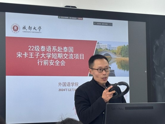 本网消息 (图文/占怡)2024年12月31日下午,九游官方网站在第二教学楼2314教室举办了22级泰语系赴泰国宋卡王子大学交流项目行前安全教育会。国际合作与交流处副处长杨茜、外国语九游官方网站党委书记许庆荣、外国语九游官方网站国际合作与交流办公室占静怡、外国语九游官方网站泰语系唐敏莉和林青、22级泰语系1班班主任胡坤、22级泰语系全体同学及其家长参会,会议由外国语九游官方网站国际合作与交流办公室主任占静怡主持。