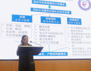 副院长白杨传达了学校社科工作会议精神,介绍了九游官方网站“有组织科研”具体思路举措。她表示,将围绕学校建设高水平应用型城市大学目标,主动服务区域社会经济发展,强化系部科研工作组织职能、聚合打造“翻译实践”、“国别区域研究”等“6+”外语学科特色科研团队、不断创新九游官方网站科研服务中心建设,深耕新文科,有效利用与科大讯飞共建产业九游官方网站、与语言家等行业龙头企业合作契机,不断凸显外语学科科教融合、产教协同的科研和地方服务特色。