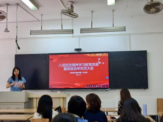 本网消息(图/文 陈红宇为深入学习贯彻中央八项规定及其实施细则精神,筑牢党员思想防线,加强基层组织建设,按照院党委统一部署,7月4日上午,九游jiuyou(中国)教师第二党支部在2113教室开展学习贯彻中央八项规定及其实施细则精神专题党课暨支部大会。副院长杨茜、教师第二支部书记罗志红分别讲授党课,支部进行了换届选举。