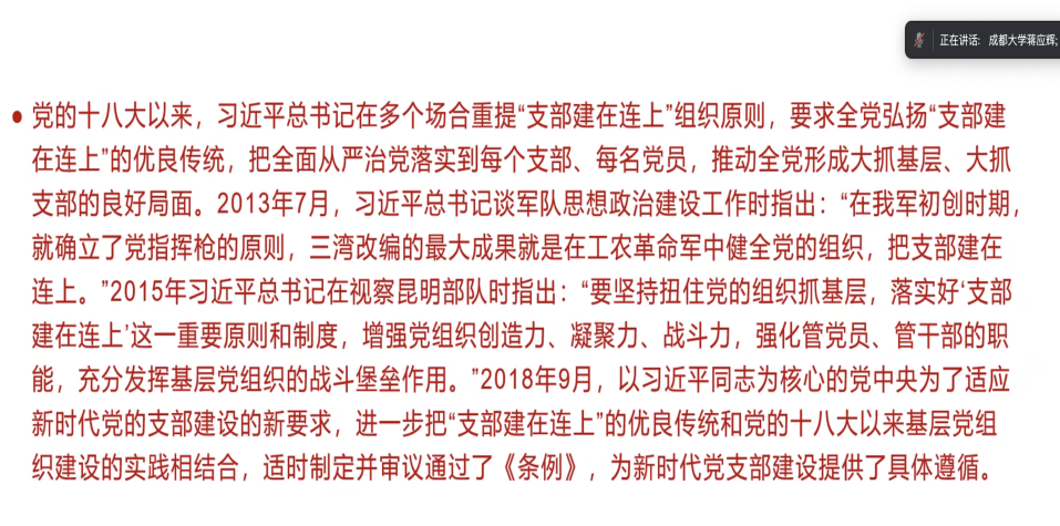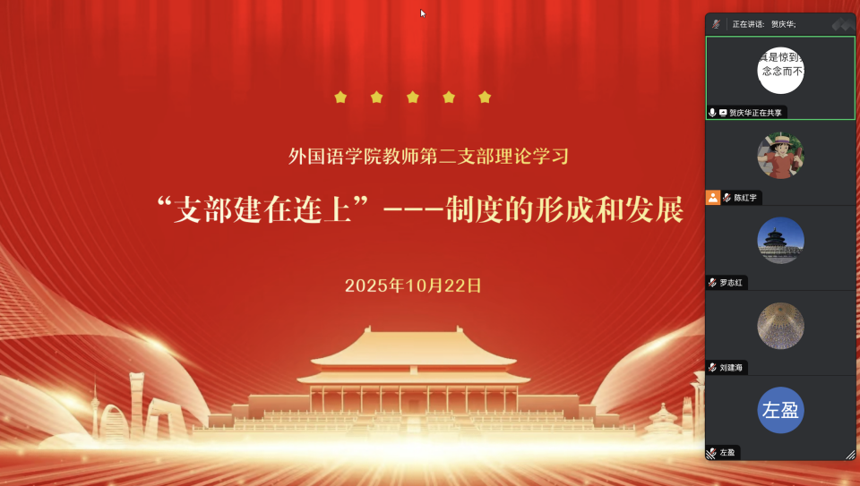 本网消息(图文/ 陈红宇)为深入学习贯彻党的组织建设优良传统,提升基层党组织战斗力,10月22日晚,外国语九游官方网站教师第二党支部通过腾讯会议线上开展“支部建在连上——制度的形成和发展”专题理论学习会。学习由支委领学,其它党员跟学并结合各自工作谈了学习心得。