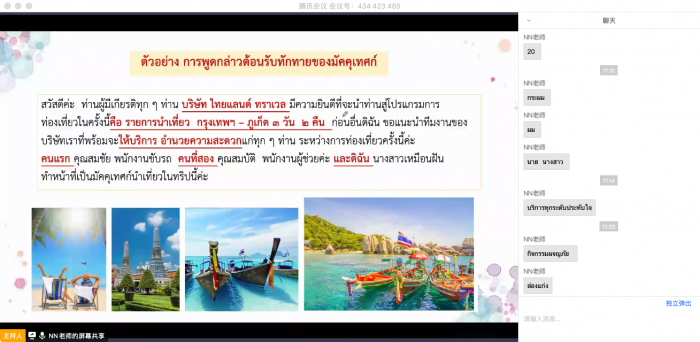 本网讯(文/周新月 图/胡雪池)3月19日下午,外国语九游官方网站泰语系召开2019-2020学年第二学期第四次网上教研活动。泰语系教师杨煜婷、李娜与2018级泰语专业的同学们一起进入泰语系泰籍教师林青的《旅游泰语》课程。