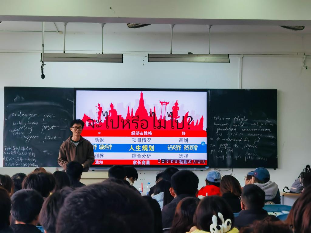 第一位分享交流的是周游同学,他从赴泰实习的原因、经历等方面讲述了自己本次实习的感受,他认为对自身的规划要根据自己的实际情况出发,实习、考研、留学要根据情况做好协调,周游同学通过照片给同学们分享了自己在泰国的实习生活,他认为本次赴泰实习不虚此行。