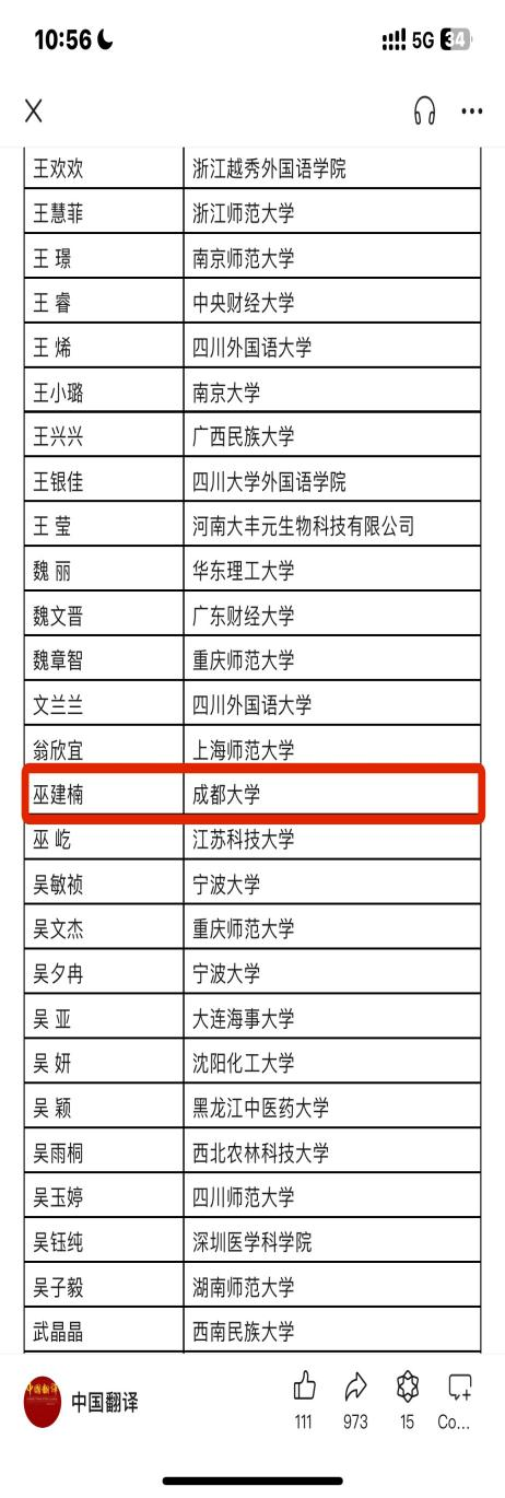 巫建楠同学表示,韩素音国际翻译大赛不仅是语言与文学的较量场,更是一个促进自我挑战与成长的宝贵平台。在备赛期间,她在老师的悉心指导下,查阅资料,精心构思译文,始终秉持着勇于尝试、挑战自我的态度。赛后,她深刻认识到自己在语言表达与思维深度上的不足,但同时也为自己的勇敢尝试与不懈努力感到自豪。这次经历让她更加坚信,只要勇于挑战自我,不断学习与进步,未来定能在人生的道路上绽放耀眼的光芒。