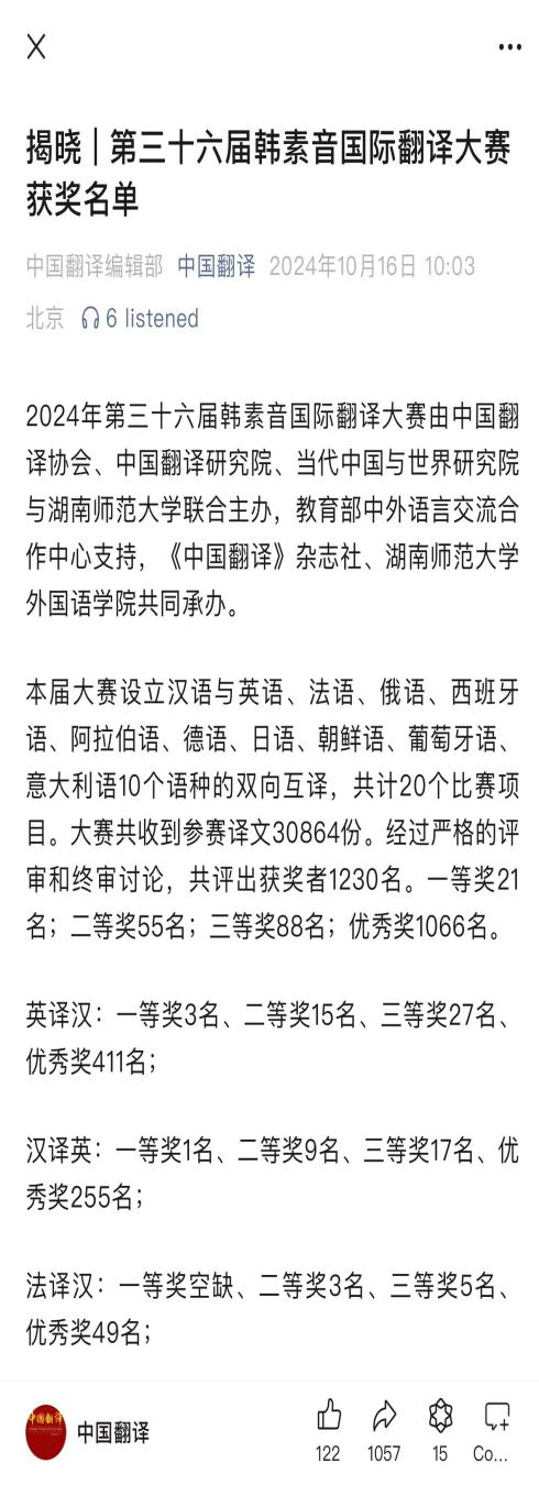 本网消息(图文/巫建楠)在2024年上半年,九游jiuyou(中国)学生积极响应并参与了第三十六届韩素音国际翻译大赛的报名。近日,大赛获奖名单揭晓,来自英语专业2021级4班的巫建楠同学在汉译英组中荣获优秀奖。