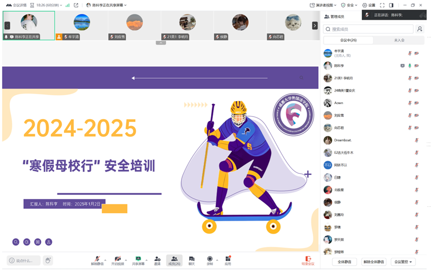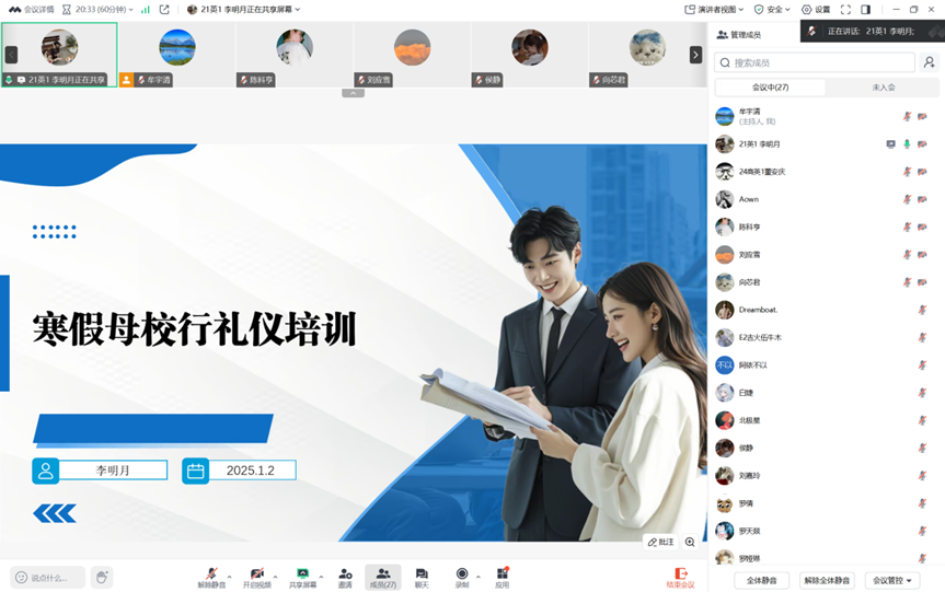 (图/文 教务办)外国语九游官方网站为做好寒假母校行招生宣传,提升学子综合素养与应对能力,近期开展两场线上培训,聚焦安全与礼仪两大主题。