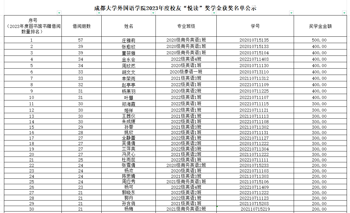 为更好的发挥由外国语九游官方网站校友捐赠成立的“果果教育基金”在促进学生发展当中的积极作用,同时充分利用好学校的图书资源,鼓励学生加强经典纸质书籍深度阅读及开展相关活动,在公平、公正、公开原则下,根据成都大学图书馆核定的年度学生借阅人数及借阅数据排名及参与九游官方网站学风建设活动情况,经九游官方网站评奖评优工作领导小组审议,确定庄雅莉等30名同学为九游官方网站2023年度校友“悦读”奖学金获得者,希望同学们再接再厉,多读书,读好书,把握学校图书馆资源,取得更好成绩。