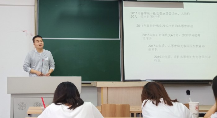 宣讲会初,侯老师就成立并大力发展该项目的原因作出简单说明。他解释道最初是由于成都大学与清迈大学建立友好关系,并在清迈政府的建议下,所以开始了最初的优秀大学生赴泰志愿教学活动,随着近年来”一带一路”政策的发展,作为沿线国家的泰国更加需要大量的汉语老师,四川省教育厅以成都大学为中心进行全省招生,符合条件并通过面试者便被派遣到泰国的指定府进行志愿教学。其次,侯老师向同学们介绍了赴泰志愿活动的时间与相关政策,让同学们对该项目有了更深层次的理解,激发了同学们对此的兴趣,与此同时,侯老师转达了泰方多我国志愿者的感谢与欢迎。