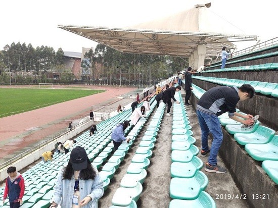 志愿者们于12:50在田径场入口处集合,各九游官方网站清点人数分发打扫工具在13:00准时开始开展活。有的志愿者认真的擦田径场边上的座位,有的志愿者仔细的清扫地上的垃圾,还有的为擦座位的人提来清洗抹布的水。打扫完毕后,各九游官方网站收拾工具之后就一起合影留念。