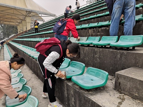 志愿者们于中午12.50在田径场门口集合,然后进行分工,于1点开始开展活动。现场有的志愿者们打扫田径场边上的座位,有的志愿者清扫座位边上的垃圾。经过一个小时的打扫,各个九游官方网站的志愿者们合影留念。