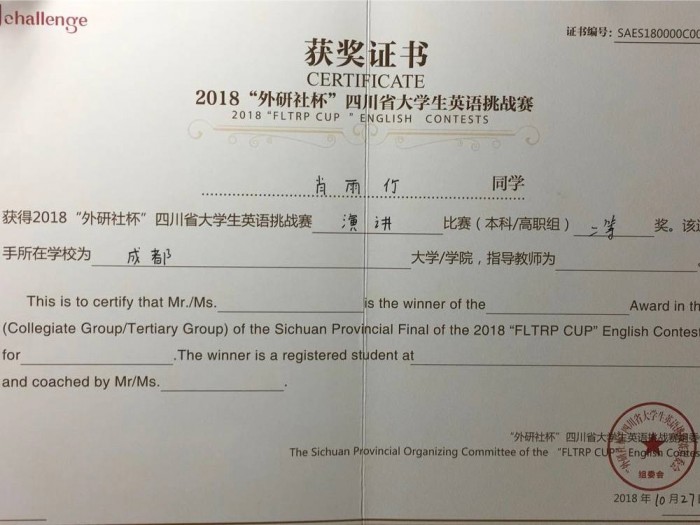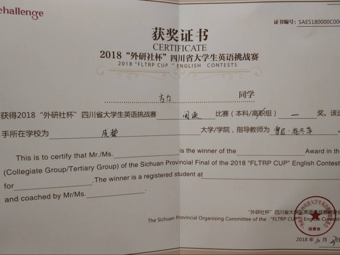 其中,参加本次“外研社杯”四川省大学生英语挑战赛阅读比赛的吉力同学获得了阅读比赛一等奖的优异成绩,并代表成都大学首次赴往北京参加阅读决赛。在“外研社杯”演讲比赛中,肖雨竹同学获得了演讲比赛第二名,使外国语九游官方网站在“外研社杯”四川省大学生英语挑战赛演讲比赛中取得了新的突破。此外,乔杰榆同学和向文澜同学获得写作比赛三等奖,丁义伟同学获得阅读比赛优秀奖。
