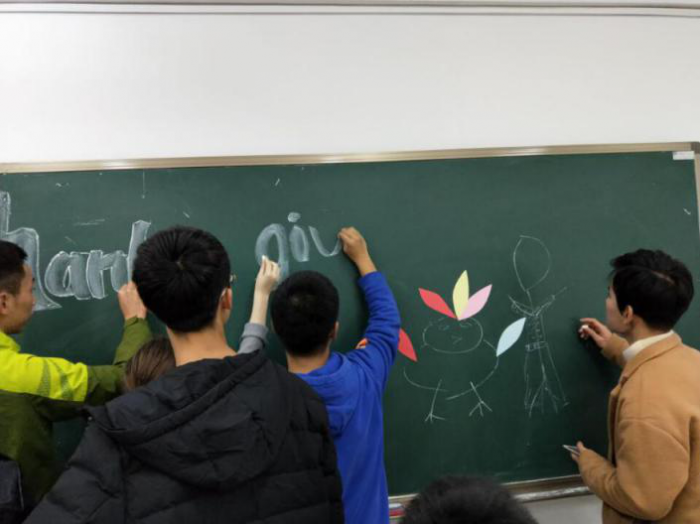此次英语口语角以感恩节为主题,外教首先为大家介绍了感恩节的由来,再并通过自己的经历和同学们分享了一些关于感恩节的趣事。同学们也积极做出反馈,向外教提出相关疑惑,得到解答后加深了对感恩节的了解。最后外教将同学们组织在一起,开展用贴纸制作火鸡的游戏,游戏中同学们积极参与,集思广益,充分发挥了自己的创作能力,制作了一只精美的大火鸡。