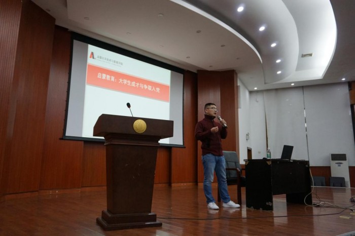 活动在主持人的介绍中拉开帷幕,而后由胡忠浩主任提出启蒙教育的主题:大学生成才与争取入党。胡忠浩主任首先解答了“什么是入党启蒙教育?”以及“为什么要开展入党启蒙教育?”等问题。接着他从成才和入党两方面展开话题,从人才的定义与标准、成为人才的重要性、成为人才的途径与争取入党、成才与入党的关系五个方面对我们提出希冀与要求,为我们指明方向。