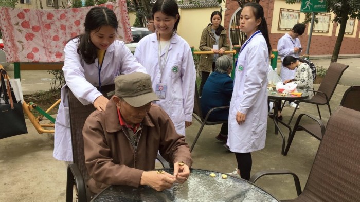 一路上志愿者同学们欢声笑语,对于17级的新同学们来说,进入大学志愿者的一切都充满了新奇,不断的交流着有关于志愿者的各种见闻,不一会儿便来到江华社区。大家迅速的布置了场地。在场地外,大家各自分组进入社区中与爷爷奶奶们宣传本学期的服务项目,在场地内,志愿者们在忙碌的测量着血压,准备艾灸的材料,给爷爷奶奶捏肩,在交流的进行中也在和老人讲述着关于身体的小知识,爷爷奶奶们在进行服务的过程中,也讲述起了旧事,感慨着生活的不易,年轻的志愿者便簇拥着他们。药草需要更换,便立马就上去迅速的换掉,更换好又回到原位,细细的听着往事。