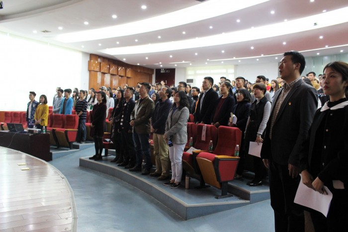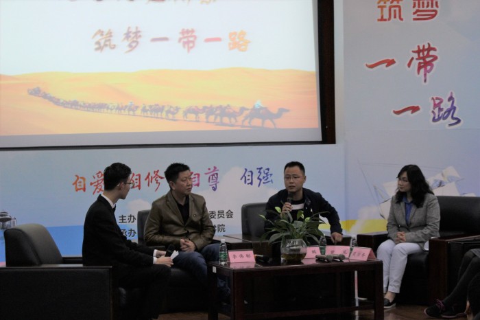 岳鹏副教授解析当前“一带一路”的政策背景,从连接到链动,指出一带一路是追梦、筑梦、圆梦的过程,并分析了成都在“一带一路”中的作用和地位。李伟彬教授则谈到“一带一路”政策下人才培养的效果不会增加就业机会,但是会增加外语复合型人才的需求。从教学服务上,适合行业特点,突出技能,翻译技能,与现代技能相结合,在当前一带一路的背景下,需要的是不仅是语言,还有文化,具有实践能力,运用能力,思辩能力的外语复合型人才。曾尼副教授和周怡乔老师则建议在座同学们做好大学里的学业规划,一带一路增加了更多对外交流的机会,需要提升自己的五个能力,包括语言能力,思辨能力,学习能力、跨文化交际能力,商务实践能力,在外语+的时代里,同学们要夯实基础,才能把握机遇。最后,各位老师分别用一句话结束了本次论坛。李伟彬教授“东方文化,西语表达,传达中国的声音”,岳鹏副教授“修学储能,一带一路是储梦圆梦之路,也是创新创业的路”,曾尼副教授“梦想就在前方等你,只要你坚持,梦想就不会提前退场”,周怡乔老师“Future Back Vision,你能为未来的自己做些什么”,老师们精彩的论说赢得了现场热烈的掌声。