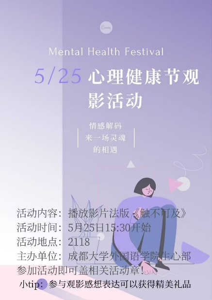 通过观看电影的方式,引发同学们对于电影故事情节及角色的情感共鸣,借此增进对于人性、情感与心理的理解与启发。通过此活动,可以提高参与者的心理素养,加深对于心理学知识的理解,促进心理健康的维护和提升。