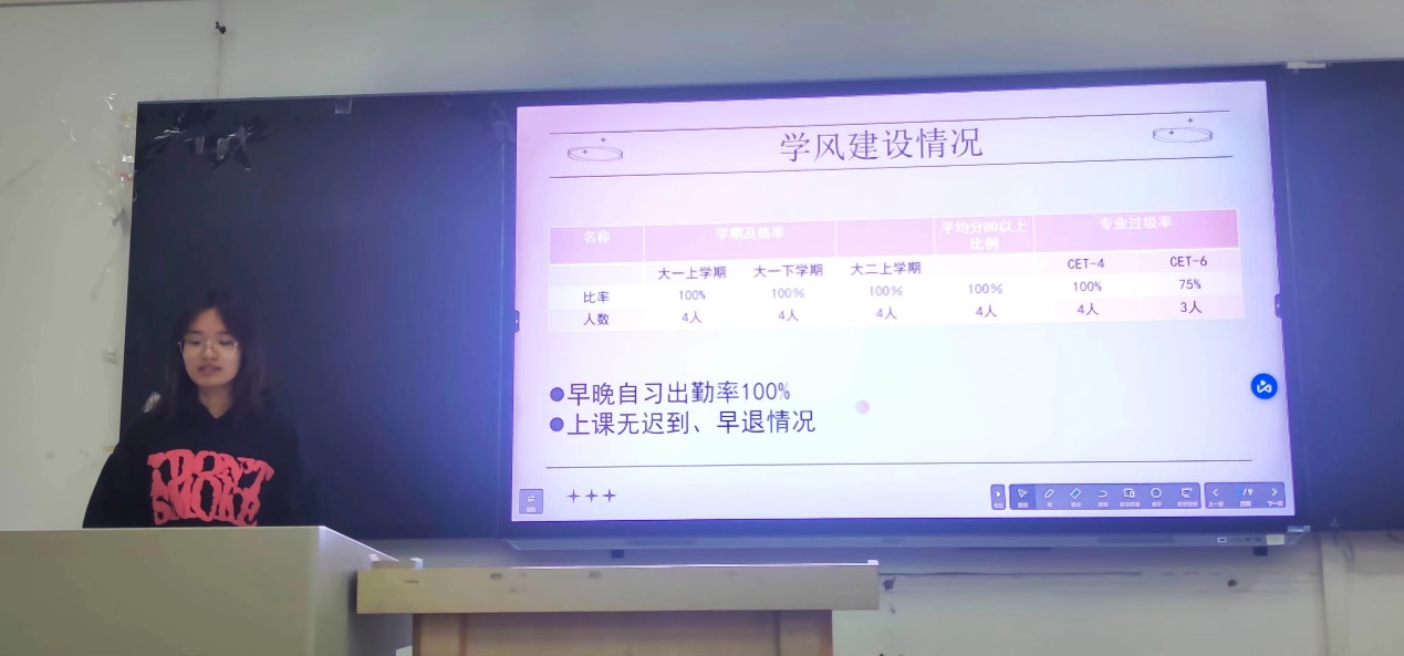 经过前期选拔,9栋305,338,417,448,611和620六间寝室从45间参选寝室脱颖而出,进入评选活动决赛。各寝室根据抽签顺序,就寝室风采、寝室氛围和寝室特色等方面上台进行PPT路演展示。选手们或慷慨激昂,或娓娓道来,阐述内容丰富,富有感召力和激励性,都体现出各自寝室的独特风采。每个寝室展示完毕,评委对选手表现进行点评和指导,为参选寝室提出针对性建议。路演展示环节完毕,裴天凤对本次活动进行总结发言,并鼓励同学们继续在更大的舞台展示个人风采和寝室魅力。